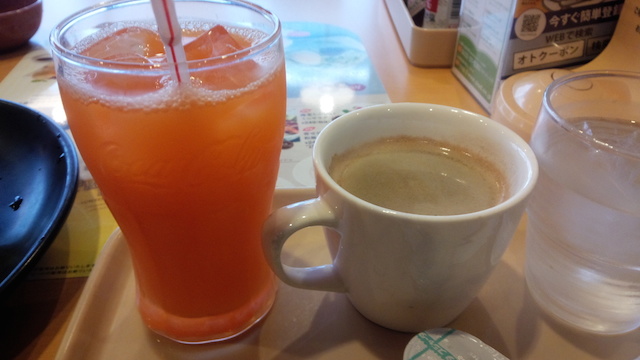 先だって食べたステーキとアボガドのサラダご飯。 その姉妹(?)ご飯をチョイス。 今回はドリンクバーとデザートが一緒になったフェアセットをつけました。 ドリンクバーは,いつものとおり。 野菜ミックスジュースとアメリカンコーヒーを。 メーンのサラダご飯です。 具材はマグロとアボガド、貝柱? 赤ピーマン,レタス,刻み海苔。 これをわさび醤油でいただくわけです。 ステーキとアボガドご飯のときは、和風ポン酢ソースでした。 これが実によくマッチして、美味しさを増幅させていました。 今回のわさび醤油は平凡です。 マグロはともかく,アボガドには合わないような。 個人的な感想ですが。 この種のご飯,トッピングが豊富でヘルシーです。 いわゆる普通の丼より、健康的。 いろいろ食べ歩きたいものです。 デザートの白桃ゼリー,これは余計でした。 酒飲みなので,スイーツは苦手。 今度からは,ドリンクバーだけにします。