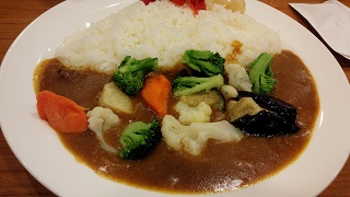 子供が好きな食べ物にカレーライスがあります。私もかっては好きでした。現在は、栄養のバランスを考え、単品ご飯は控えています。この店は、チェーン店でしょうか。かなり昔からあります。以前食べて気に入ったコロコロ温野菜カレー。野菜中心のヘルシーカレーライスです。久しぶりにいただきました。マイルド、中辛、激辛から選べます。たまには、と決心して、中辛にしました。最初の一口を食べた時、ピリッと舌に来ました。水を飲んで食べ続けます。今度はむせることはありませんでした。にんじん、ブロッコリー、ジャガイモ、茄子、ピーマンなど。野菜は多いほうでしょう。カレーの味は、寝かせが足らないように思われました。福神漬け、らっきょがフリーサービスなのは、点数が高いです。らっきょが好きなので、やや多めに取りました。家でもらっきょのハチミツ漬けを時々食べています。梅干しとともに、必須の常備食ですね。