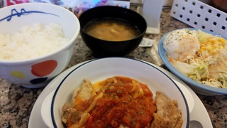 これも期間限定の新メニューでしょうか。大きめのポスターが貼ってありました。店としては、力を入れているのでしょう。例によって、なくならないうちに食べることに。チケットがあったので、ポテトサラダを追加しました。生野菜の端に、ちょこんと乗っています。生野菜、ポテトサラダ、味噌汁の順に胃袋へ。これが定番の食べる順番です。味噌汁を半分残して、トマチキに箸を伸ばします。厚切りのチキンを鉄板で焼き上げ、特製のきのこ入りトマトソースをかけた逸品。というのが謳い文句。はたしてその実態は?久しぶりのヒットでした、私的には。トマトソースは平凡な味です。厚切りのチキンが美味しいのでした。これはお薦めしてもいいでしょう。ただし、この商品、順次販売終了するようです。興味のある人は、早めにどうぞ。