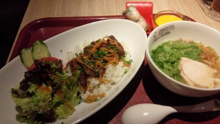 タイといえば、トムヤンクンが有名。スープの一種です。ルミネエストの7階にエスニック専門店が。50周年記念のメニューがあります。「ヌアヤン・ボールと選べるフォー」とは。ゴイクン(海老の生春巻き)タイ風ステーキ丼、蒸し鶏のフォーまたはあさりそば。日替わりプチデザート。ヌアヤンとは、焼き牛のことらしいです。ごはんの上に、切り落とした牛肉が並んでいます。案外、クセがない焼き味です。すんなりと口に入りました。蒸し鶏のフォー、パクチーがばっちり入っています。これはベトナム料理ですね。細麺ですから、するすると口に入ります。これもクセがなく、エスニックとしては、やや淡白。海老の生春巻きも同様でした。この店は、激しく日本風にアレンジしてあります。万人好み、あるいは女子好み、といったらいいでしょう。日替わりデザートは、パンプキン・ゼリーでしょうか。スイーツにはまったく興味がないオヤジです。セットなので、食べました。もしアルコールを飲んでいたら、口にしなかったかもしれません。味はまずくなかったですが。タイとベトナムが混在したワンプレート・ランチ。可もなく不可もなく、とでも言いましょうか。ただし、おじさんの嗜好には合いませんでした。