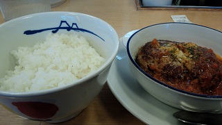 期間限定のメニューです。フルネームは、香味野菜ミートソースハンバーグ。生野菜と味噌汁が付いています。発売記念で、ライスの大盛り特盛が無料とのこと。むろん、普通盛りにしました。ふっくらハンバーグにオリジナル香味野菜のミートソースをかけ、チーズをトッピングした、ボリューム満点の逸品。これがお店の謳い文句。うーん、微妙なところですね。まずくはありません。が、取り立てて美味しいとも思わないのです。私の舌がイカれているのでしょうか。店によっては、鉄板で出すところもあるようです。ネットでは、これが美味しいというルポがありました。味覚は人それぞれなので、そう感じても文句はありません。外食のデフレ競争は一段落。円安による原料高で、徐々に値上げにシフトしています。人手不足も深刻なよう。消費者としては歓迎できない傾向ですが、企業も生き残るための措置ですから、傍観するしかないでしょう。いやなら自炊しましょう。