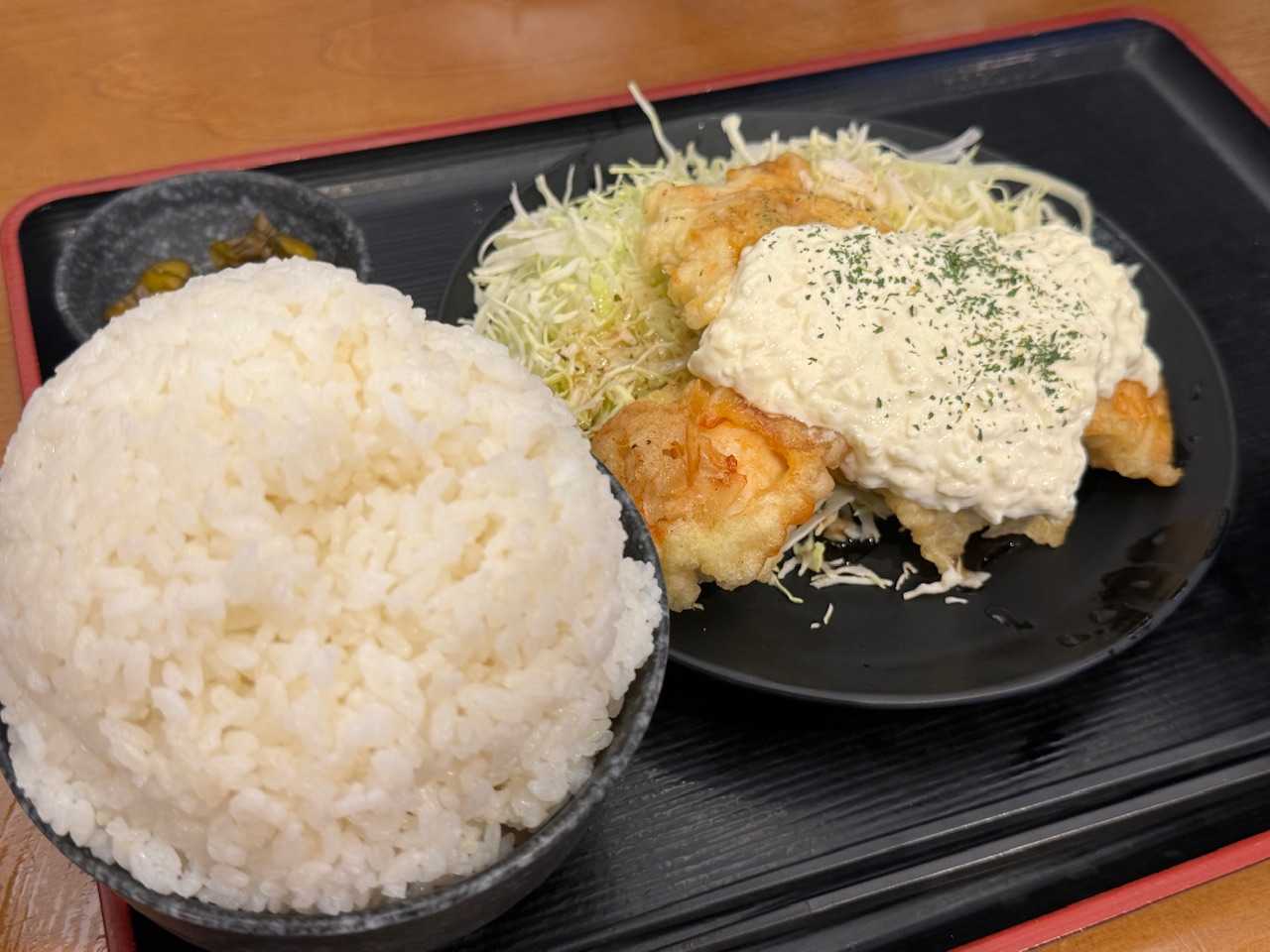 今週は朝から寒い日が続きますが、仕事では安定の外出が続いていたので、身も心も冷えました😭冷たい風もですが、仕事も忙しいので、お身体が疲れました。週末で疲れた身体を癒すためにもお昼はモリモリご飯🍚を食べることにしました😝タルタルチキン定食とご飯🍚特盛です。美味しいご飯をたくさん食べると、幸せを感じますね🥰ついにランチ代も安くて790円になったので、賃上げに期待したいです😆