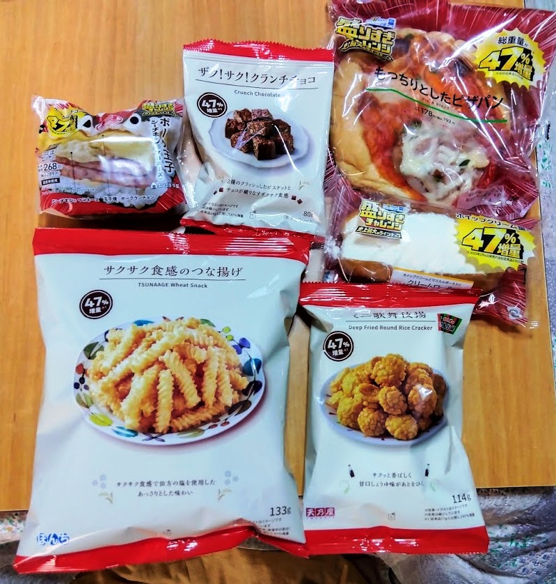 ローソンの盛り過ぎチャレンジその3です。 たまたま2点手に入りました。チーズケーキとロールケーキです。 今週はふわ濃チーズケーキです。中々ですね。 層になっています。確かに濃厚で美味しい~。チャーシューマヨネーズおにぎりです。持った感触が前回よりちょっと軽い気がします。 もしかしたら元の大きさが前より小さくなったから大きくなっても前回より小さめなのかも。 具がたっぷりです。でも、やっぱり前回より小さくなってると思うのです。あらびきポークフランクロールです。これは前と同じかな~。 大きな厚切りハムカツと大きなタレつくね串なんこつ入りです。つくね串が大きいとはっきり分かります。二個ほど冷凍してダンナの弁当に使う事にしましたw。 ポテトたまごサンドです。いつも一切れ増えてるw。 ポテトサラダが増えてるそうです。ボリューム満点~。 ヤマザキビスケット エアリアル コーンポタージュ味です。袋大き目~。 でも100グラム超えてないのに闇を感じます。普段50グラム台なんだな、今は~。 今回かなりラインナップが凄いです。いよいよ来週でファイナル~。