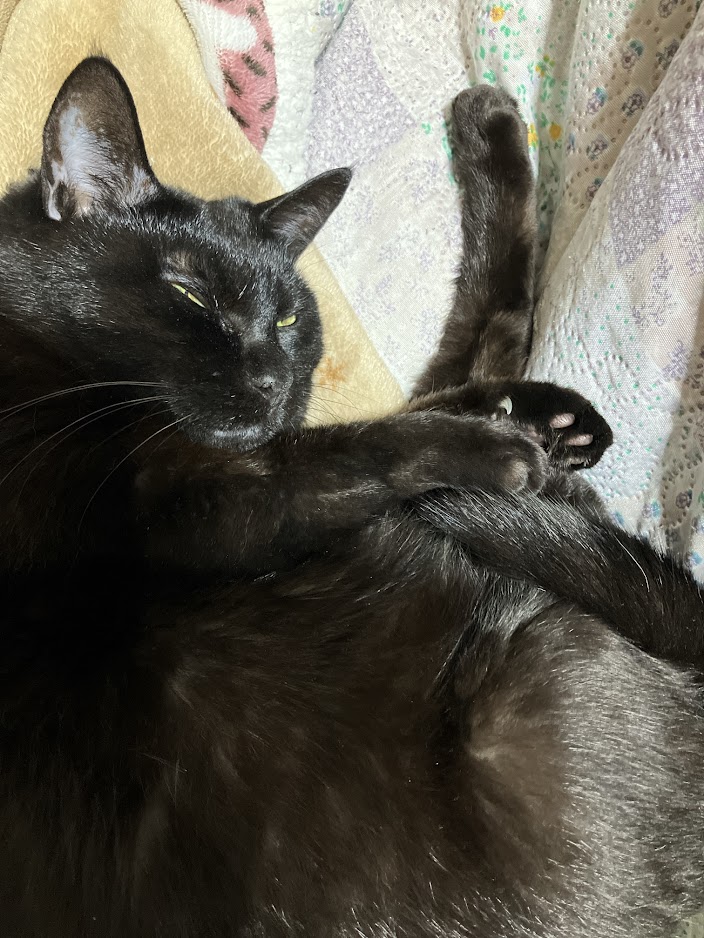 黒猫あんみつさんはリラックスしまくっています。 こうなっているともう何をやってもノーリアクションw。 寒い時はこたつの中から出てきませんが、多分やってることは一緒ですw。