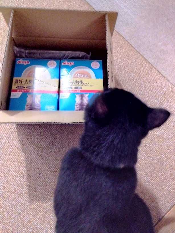 お試し用の猫用ウエットフードを買ってみました。黒猫あんみつさんが覗きに来ますw。 トロミがついているタイプなのでお気に召す可能性は高いと思います。どうなるかな~。