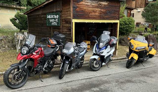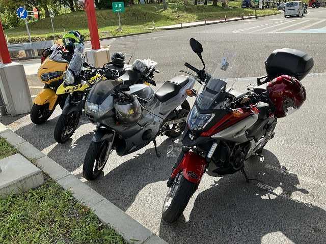 今回のバイク整列。アクロスは、購入してから来年で30年になるけど、それを上回るつわもののブログがあったのでリンクしておきます。アクロスで38万キロ越え。私は間もなく7万キロなので、まだまだ保持したいものです。 お野菜いっぱいの朝食を食べて出発! 帰路も予報では雨。見た目には天気が良かったのに、雨と言われたら仕方ないので合羽を着ます。走ってみると、太陽も出てきて暑くてサウナ状態。本当に降るのか、疑わしいまま走行していると、高速道路では子供救急搬送車が接近。進路をゆずったけど、結局途中で追いついてしまったので、そのまま追い越しました。その間 予報通り、軽く雨に降られました。 休憩場所で合羽を脱ぐと、今度は雨ではなくて汗でシャツがべとべと・・。 名古屋港まわりしない?と誘われたけど、着る服が無くなって困った状態だったので、今回は恵那峡で解散し、一人帰路につきました。この距離を一人で走るのは初めてかも。 案の定 途中は大雨。とにかく早めに帰ることを目指しました。帰ったらさっそく風呂入って、洗濯もしました。往復約700kmのツーリングも終了です。 天気が悪いと、本当に行く場所が制限されて困ります。例年 寒さと調整する場合がほとんどだったのに、今年は気温より雨対策で四苦八苦。何かと学ぶことの多かったツーリングでした。