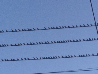 100m位の電線に、ビッシリと・・・下を通ろうとしたらフン害!100m向こうを通るわけにも行かず上を見ながら、ささっと通った電線がなくなったらどこに行くんだろうな・・・・