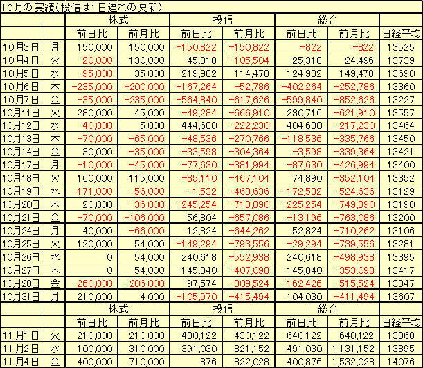 日経平均 13868円 +261円売買なし前日比 +640,122円 前月比 +640,122円 累計損益 -4,120,638円(内訳)株式 前日比 +210,000円 前月比 +210,000円投信 前日比 +430,122円 前月比 +430,122円(投信分は1日遅れの更新)マルハ 現物 283円x10000株(終値 283円 前日比 -2円)東洋紡 現物 291円x10000株(終値 302円 前日比 +9円)西友 現物 240円x10000株(終値 243円 前日比 +6円)アツギ 現物 206円x10000株(終値 205円 前日比 +2円)北川鉄工所 現物 268円x10000株(終値 280円 前日比 +6円)-----------------------------東証システムダウン。昨夜のアメリカ好調で今日は上がる日だらうが! ゴルア!!でも、再開後1時間半で+261円ですか。うん、まあ、許してやらうか。ま、東証も悪気があつてのことではないだらうしな。若いうちはいろいろあるわな。わしもその辺のところはわからんわけではない。これを肥やしにして、これからどう成長してゆくか、うん、それが大事、それが大事ではないのかな?ふおっ、ふおっ、ふおっ。