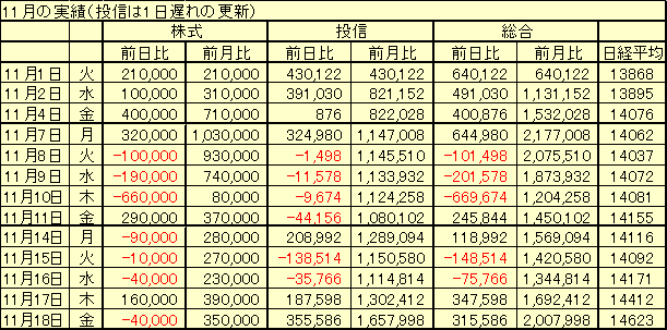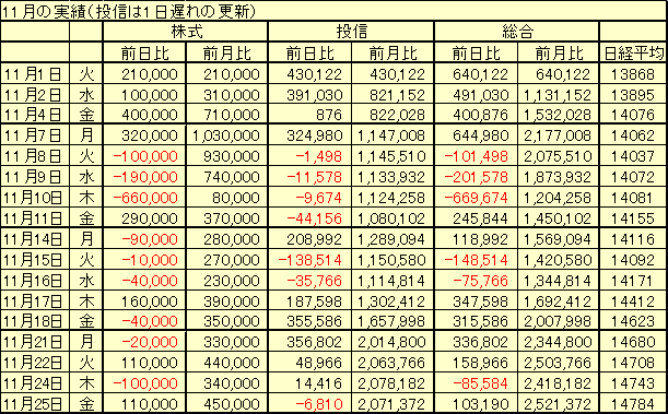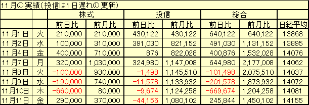 日経平均 14987円 +203円売買なし前日比 +164,826円 前月比 +2,686,198円 累計損益 -2,074,562円(内訳)株式 前日比 +40,000円 前月比 +490,000円投信 前日比 +124,826円 前月比 +2,196,198円(投信分は1日遅れの更新)グラフテック 現物 219円x10000株(終値 221円 前日比 +3円)東洋紡 現物 301円x10000株(終値 304円 前日比 +6円)マルハ 現物 271円x10000株(終値 270円 前日比 -2円)コスモ証券 現物 312円x10000株(終値 315円 前日比 +1円)佐田建設 現物 188円x10000株(終値 176円 前日比 -4円)-----------------------------日経は上がるのにわが株は上がらず、の、前場だつたけれど、後場なんとか回復。たうとう15000円が見えてきた。なんでもいい、上がつてくれい!明日は会社勤めの最終日。勤続**年を思へば感慨深いものもあるが、普段と同じに勤めよう。それがわがダンディズムである。