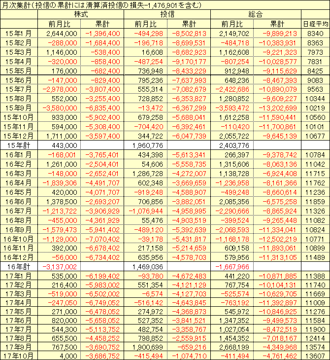 日経平均 14170円 +79円マルハ 現物買ひ 271円x10000株コスモ証券 現物買ひ 305円x10000株前日比 -75,766円 前月比 +1,344,814円 累計損益 -3,415,946円(内訳)株式 前日比 -40,000円 前月比 +230,000円投信 前日比 -35,766円 前月比 +1,114,814円(投信分は1日遅れの更新)グラフテック 現物 219円x10000株(終値 215円 前日比 -5円)北川鉄工所 現物 284円x10000株(終値 296円 前日比 -2円)マルハ 現物買ひ 271円x10000株(終値 269円 前日比 -1円)コスモ証券 現物買ひ 305円x10000株(終値 310円 前日比 +12円)-----------------------------ここまで下がれば、とマルハ成行買ひ。コスモ証券も後場仕込んだ。監視株、前場は、まだ下がるのかよと呆れるしかない動きだつたが、後場持ち直す銘柄もちらほらと。しかし日経平均と連動しないなあ。なんだか体感的には毎日-200円くらゐしてゐる気分。変な毎日。