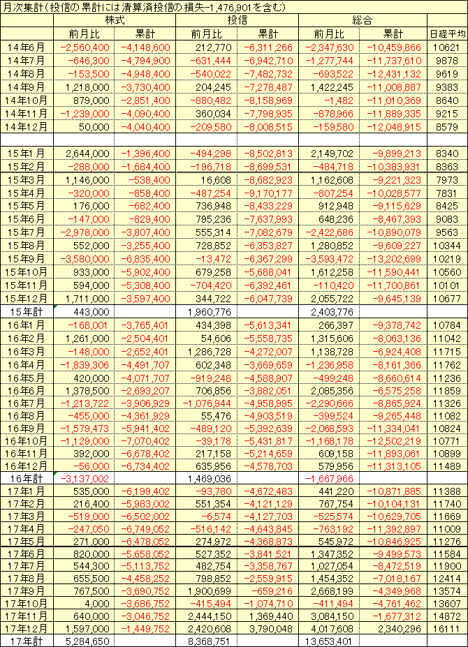去年を振り返ると、日経平均16年12月末 11,489円 17年12月末 16,111円上昇率 +40.2%わが投信評価額16年12月末 1,084万円 17年12月末 1,921万円上昇率 +77.2%まあなんせ日経平均に2倍連動のスーパーブルオープンが半数を占めてゐますからね、当然といへば当然の上昇率。さて、株式のはうはどういふモノサシで計るべきか。累計損益は+528万の回復だが、何%かといふとわかりづらい。そこでイートレに預けてゐる現金+株式評価額で比較してみると、上昇率 +21.9%となつた。日経平均の+40%に比べると少ないが、常に全力買ひしてゐるわけではないので、なんとも言へぬところか。伴天連の祭りも過ぎて新年も2日めである。明日はオートレースに打ち初めに出向く予定。正月の打ち初めは祝儀である。散財を目的として遊ぶ。結果、儲けられればそれはそれで良し、さういふものだ。新年の運だめし、運だめし。