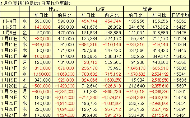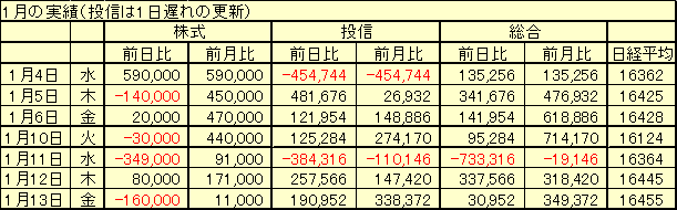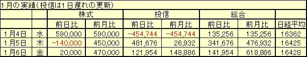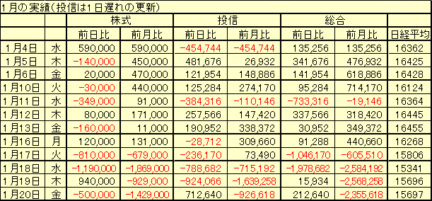 日経平均 15696円 +355円売買なし前日比 +15,934円 前月比 -2,568,258円 累計損益 -227,260円(内訳)株式 前日比 +940,000円 前月比 -929,000円投信 前日比 -924,066円 前月比 -1,639,258円(投信分は1日遅れの更新)プリマハム 現物 213円x10000株(終値 201円 前日比 +13円)アツギ 現物 225円x10000株(終値 212円 前日比 +13円)日新製鋼 現物 375円x10000株(終値 363円 前日比 +11円)北川鉄工所 現物 396円x10000株(終値 369円 前日比 +19円)トーヨーカネツ 現物 379円x10000株(終値 352円 前日比 +30円)西友 現物 379円x10000株(終値 359円 前日比 +8円)-----------------------------朝、今日こそは戻るだらうと気配値を見るに北川がストップ安。え゛?いくら気配値とはいへ気分はどん底。場が開いてストップ安ではないが、北川と西友が特売り気配スタート。ほんとに死ぬぞ。が、すぐに上昇に転じて、生き返つた。買ひも考へたが自重。まだ何が起こるかわからない。昨日の-700円のときに売らなかつただけ大したものだつたとしよう。あのときからは200万戻した勘定だ。ふう~。しかしまだこれからだ。投信分の明日反映分を勘定に入れてもまだ前月比-200万くらゐ。先は長い。それにしてもライブドアの影響は予想通り軽微だつた。前場はプラスで引けてゐた。ところがマネックスが担保掛目0なんてしたから、他の証券会社を使つてゐる人までパニック売りが出た。かてて加えて東証が「何時何分か分らぬが」件数オーバーしたら停止するなんて阿呆な発表したから売りが炸裂した。最初から「何時何分」と明確にしてゐればあそこまでは混乱しなかつた。どいつもこいつも馬鹿ばかりか?