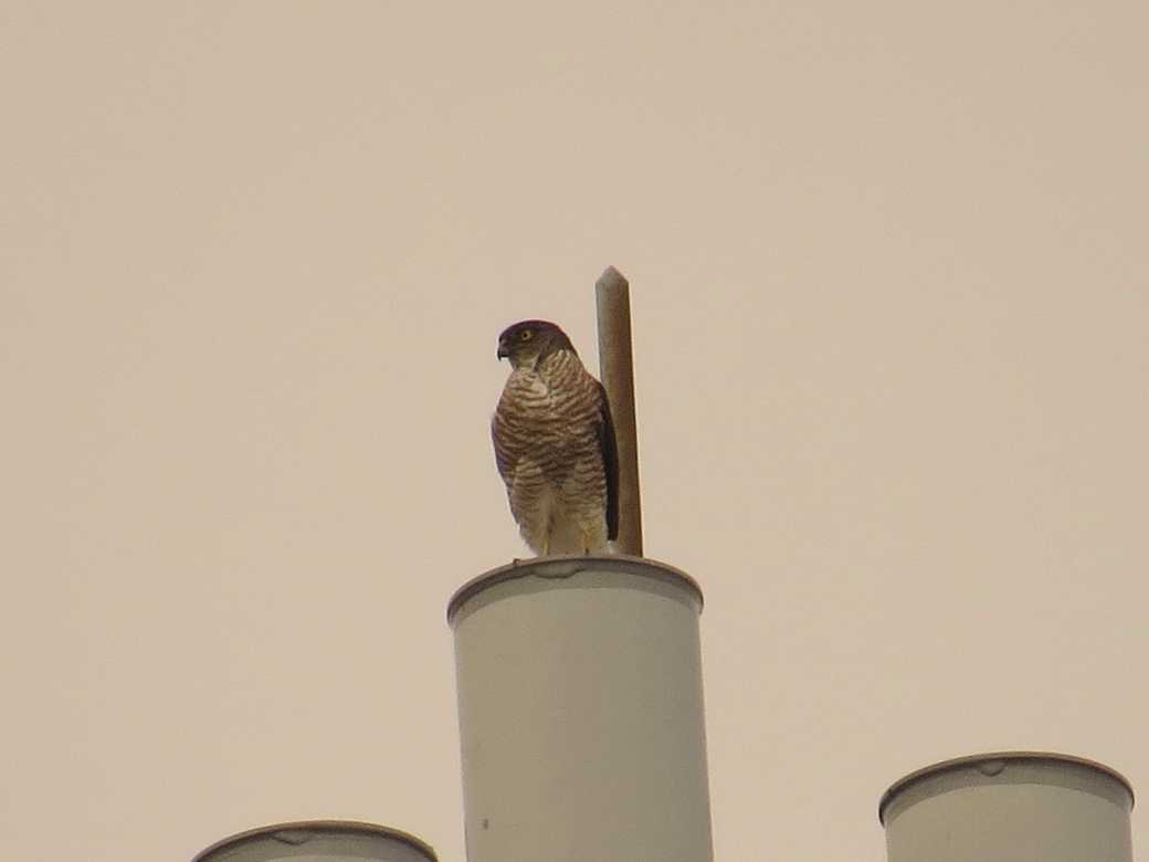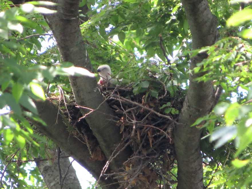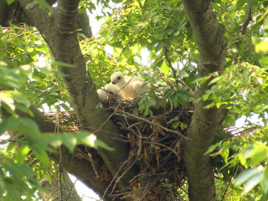 鳥友の街の高層集合住宅の谷間にある公園の一角でツミが営巣しています。3羽のヒナが誕生し、立ち寄るたびに成長しているのを実感します。白い第一綿羽から一週間ほどで第二綿羽に換わり頭頂、背、翼などの上面がバフ色を帯びてくるとされています。今朝のヒナの様子をみるとこれを実感します。逆算していくと、6月20日前後が誕生日ではと推定できます。また、親鳥に注目してみると、成鳥雌は29日までは巣にとどまって雄が運搬してきた獲物をちぎってヒナに与えていましたが、強い日差しからヒナを守っていた2日を除き巣を離れることが多くなっています。今朝は地上高30メートル程度の集合住宅屋上に成鳥ペアが巣を見下ろして見守りをしていました。(写真)2022年7月4日撮影