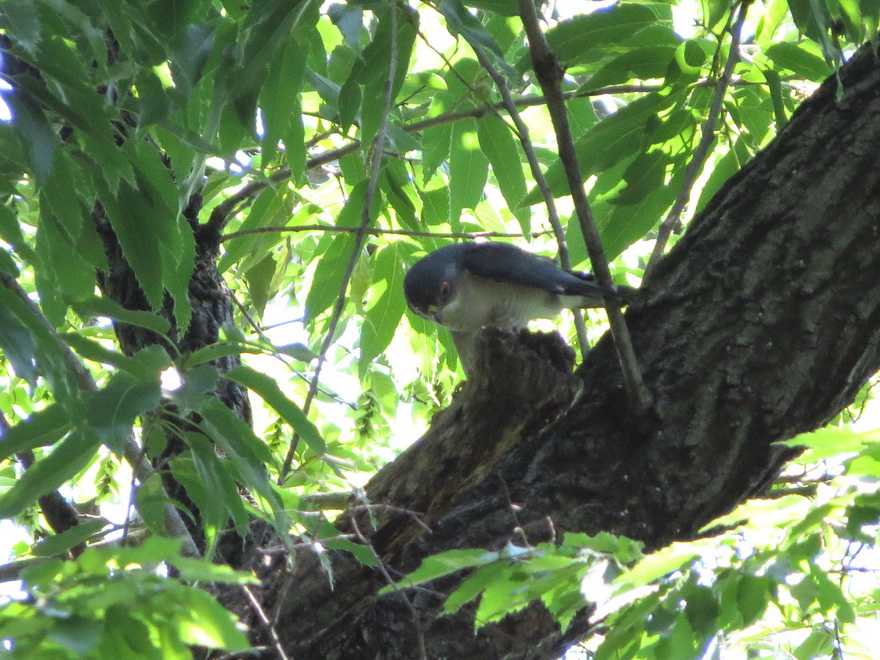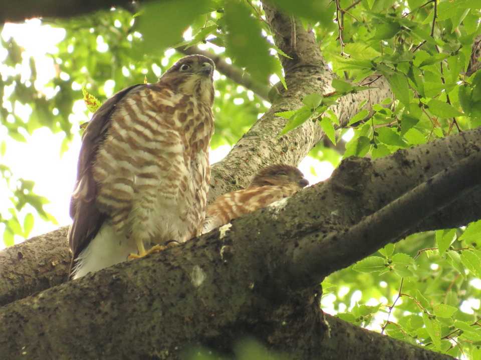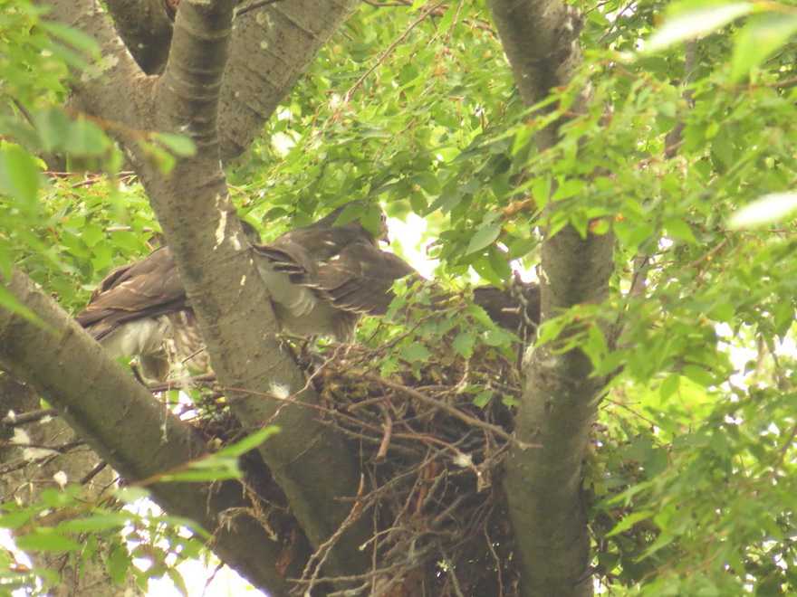 鳥友の街の高層集合住宅の谷間にある公園の一角でツミが営巣しています。今朝、観察していてヒナが3羽存在していることがわかりました。酷暑の中、ヒナを強烈な日差しから守るために翼、尾羽を思い切り広げてその下にヒナが休んでいます。今年はじめて産卵・子育てをしている雌なのに真夏の子育て術を習得しているなんて、脱帽です。(写真)2022年7月2日撮影しゅう