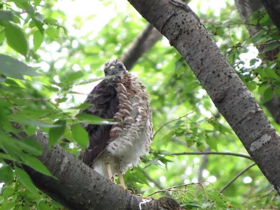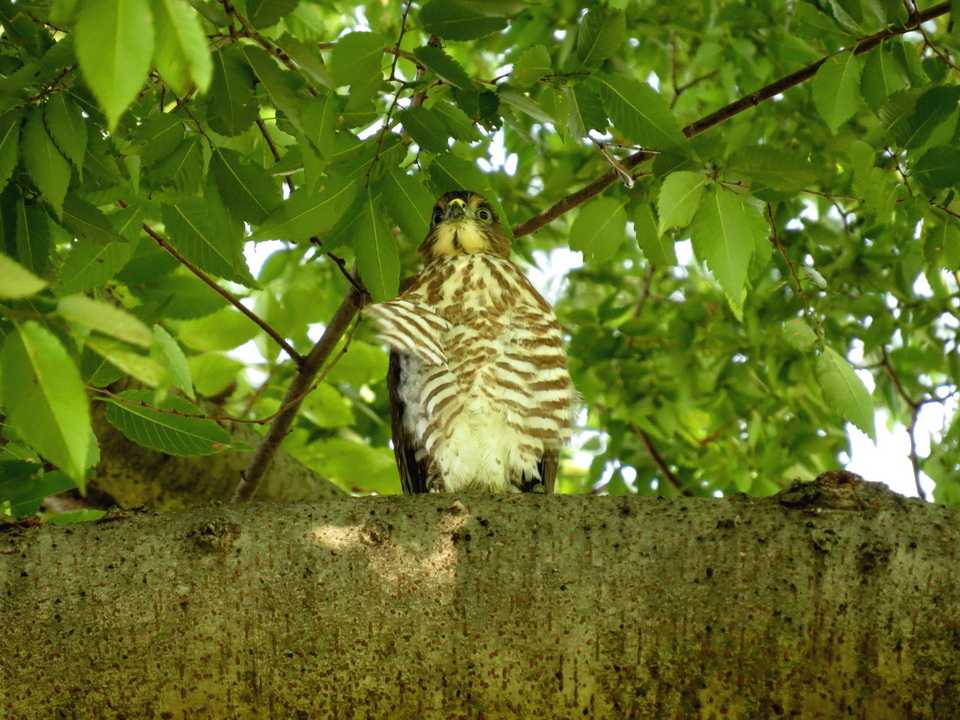 鳥友の街の高層集合住宅の谷間にある公園の一角でツミが営巣しています。ヒナの誕生は親鳥の動きから6月22日頃と推定されます。以降、昨日までのヒナ(幼鳥)の写真をアップし成長ぶりを紹介します。6月29日:綿羽に覆われたヒナが少なくても2羽以上観察できました。まだ、日光がまぶしくて目もはっきりと開けられないように見受けました。雌が巣に滞在している間は、夏のお日様からヒナを守るのに雌は羽を精一杯広げて日陰をつくり、ヒナを覆っていました。7月2日:観察していてヒナが3羽存在していることがわかりました。6月29日と比較すると目がぱっちりとしている個体が多くなりました。この時も親鳥がヒナを強烈な日差しから守るために翼、尾羽を思い切り広げてその下にヒナが休んでいました。7月4日:白い第一綿羽から一週間ほどで第二綿羽に換わり頭頂、背、翼などの上面がバフ色を帯びてくるとされ、ヒナの様子をみるとこれを実感しました。誕生したヒナの大方が嘴の形状もかなりがっしりとしてきました。7月6日:一番先に誕生したヒナは下面が赤茶色の羽が出てきました。翼には早くも幼羽が見えるようになりました。これに対して二番仔は白い綿羽に包まれている部分が多く、ようやく胸の一部分に赤茶色の羽毛が出始めました。三番仔は、まだ姿を全部観察できていないので詳しくは不明。7月7日:一番仔と二番仔の羽は、もう幼羽がだいぶ増えてきました。7月9日:ヒナは合計5羽の姿を観察しました。ヒナのうち、四番目と五番目の仔はまだ綿羽に覆われているのに、一番仔から三番仔は幼羽がかなりふえていました。ヒナの2羽が巣から離れ巣立ちとなりました。7月12日:枝に並ぶと体の大きさが倍近く違う個体、虹彩の色が黄色味がかる個体、暗色の個体、目の大きさがひときわ大きくまん丸が際立つ個体とじつにさまざまでした。すべてのヒナが巣を離れ巣立ちとなりました。これ以降、幼鳥と呼びます。7月14日:すべて幼鳥には幼羽となり、腹に羽軸上に木の葉のような形の軸斑が見えるようになりました。角度によりハート型の斑が見えるようになりました。(写真)1枚目&2枚目6月29日、3枚目7月2日、4枚目&5枚目7月4日、6枚目&7枚目7月6日、8枚目7月7日、9枚目7月9日、10枚目7月10日、11枚目&12枚目7月12日、13枚目&14枚目:7月14日撮影