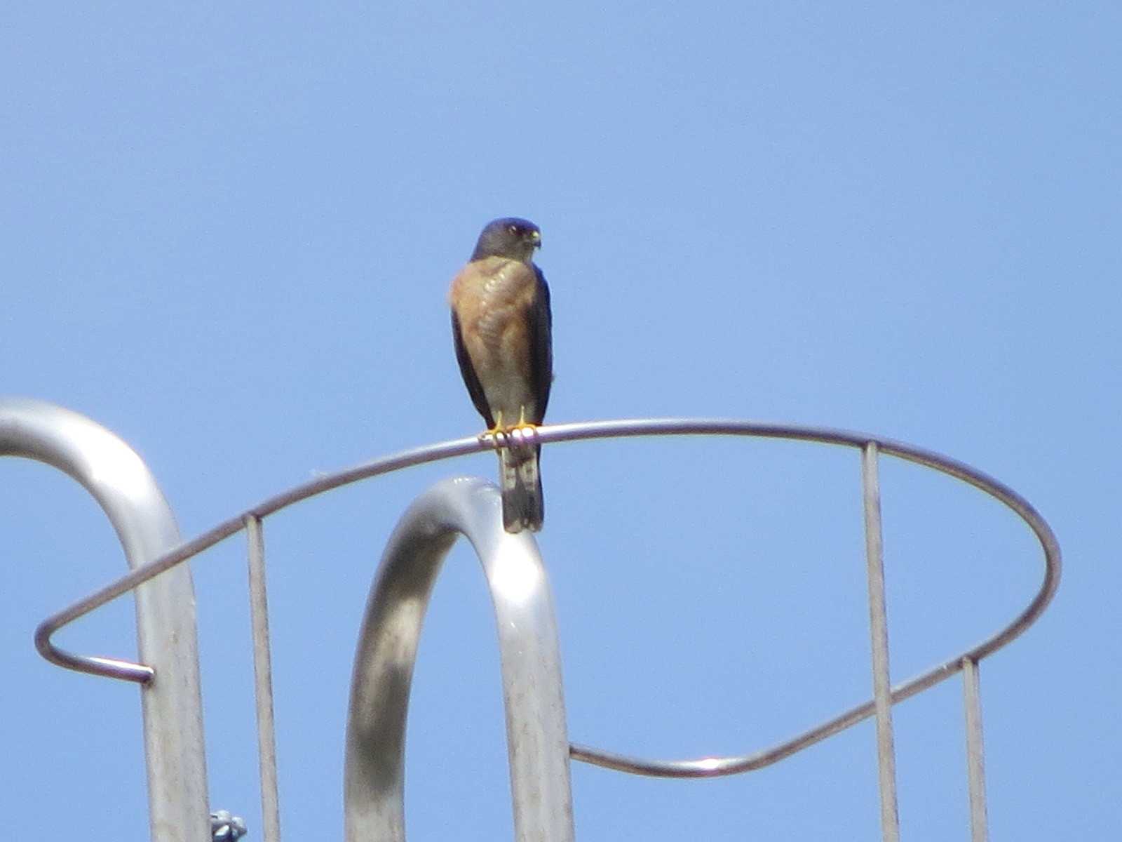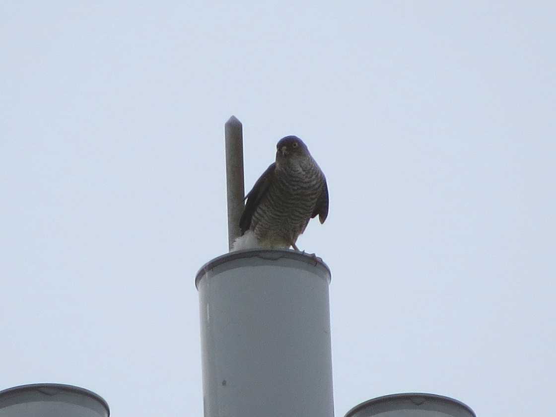 鳥友k-tsuminetさんの街の集合住宅の谷間にある公園の一角でツミが暮らしています。12日にすべての幼鳥が巣を離れる巣立ちとなりました。今朝、現地を訪ね様子を見てきました。28日には若鳥の姿は3羽観察できたものの、今朝は2羽のみでした。いつもと同様に集合住宅屋上には成鳥雄が我が子達をじっと見守る姿がありました。到着直後は風通しがよく枝に腹ばいになりやすいヒマラヤスギに1羽の姿のみでした。ところが1時間強経過した時、別の1羽がすーと飛来し公園内の低木を移動しながら近くにある商店街の桜並木に移動。ヒマラヤスギにいた個体は、餌をすでに食べたようで羽づくろいをしたり、枝に腹ばいになってくつろぎ、ウトウトしていました。28日と同様に瞬膜を閉じている光景も目撃。(写真)2022年7月30日撮影