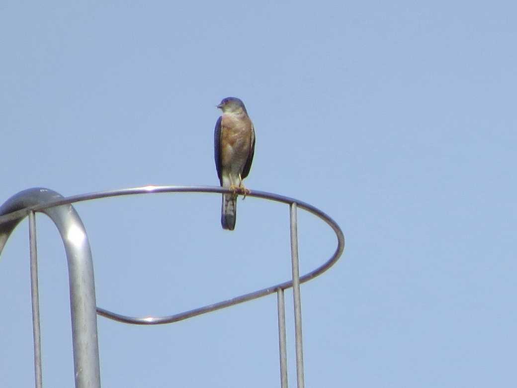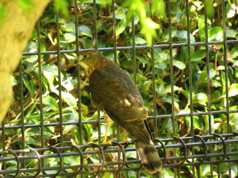 鳥友k-tsuminetさんの街の集合住宅の谷間にある公園の一角でツミが暮らしています。12日にすべての幼鳥が巣を離れる巣立ちとなりました。その後、営巣木を中心にして3羽の幼鳥が残っています。今日午後に短時間立ち寄りましたら、3羽のうち2羽は公園の小道の上でセミを捕獲したり虫を追尾していったらフェンスにたどりついたり予想しない動きを披露してくれました。また、1羽はヒマラヤスギの枝にとまり、じっと静止していました。表情を見ていると眠たくて仕方がないようで瞼をとじたり、瞬膜を閉じたりしていました。こんな表情ははじめて観察しました。(鳥類の瞼)上下の瞼のうち、哺乳類では主に動くのは片方のみでで、上まぶたが開閉します。しかし、多くの鳥類は人間とは逆で、下から上にまぶたを閉じます。(鳥類の瞬膜)瞬膜は、半透明の膜で、まぶたがある動物の場合、まぶたと眼球との間にあります。まぶたは顔の皮膚と同じで常に露出していますが、瞬膜は目の中から出てきて眼球を覆ったり開いたりします。また、瞼が垂直方向の運動をすることが多いのに、瞬膜は水平方向の運動をすることが多くあると聞いています。瞬膜が発達しているのは、鳥類や爬虫類、無尾両生類、魚類の一部(サメ類)です。(写真)2022年7月28日撮影