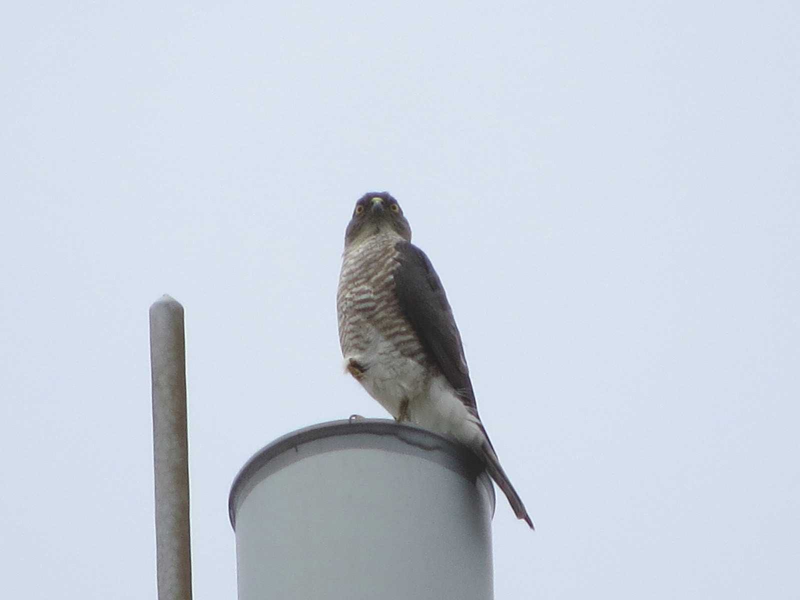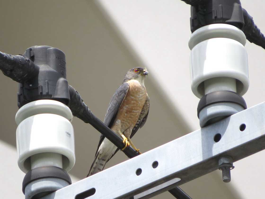 鳥友のk-tsuminetさんの街の集合住宅の谷間にある公園の一角でツミが営巣しています。昨日は強い雨があったり雷がなったり、今日も雨があったりやんだりと巣立ちした幼鳥たちにとっては過酷な条件となっています。雨風の影響で巣や枝から落下していないかと気が気でないので、現地に立ち寄りました。雨のやみ間に到着してすぐに巣をみると、巣はからっぽでしたが枝に幼鳥たちの姿がありました。すぐに雨が降り出すと、幼鳥たちは申し合わせたように巣に帰還し、一羽ずつ座り込み、じっとする体勢をとっていました。この間も集合住宅屋上には成鳥雌がいて幼鳥たちをじっと見守っていました。少しして、雌が連続した鳴き声を出したと思ったら、雄が獲物をとってきて空中で雌に受け渡したとおもったら、雌はそのまま巣に帰還。座り込んでいた幼鳥たちは、親が持参した獲物を受け取るために腰をあげついばんでいるようでした。その後、満腹になった幼鳥たちは、巣すら枝に移動し羽づくろいをしたり、周囲を見渡したりを繰り返していました。(写真)2022年7月14日撮影