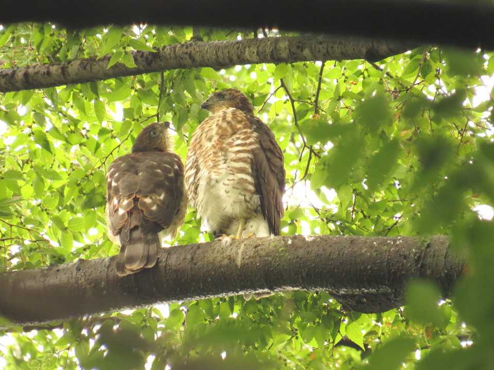 鳥友k-tsuminetさんの街の集合住宅の谷間にある公園の一角でツミが営巣しています。今朝、雨が降る前に現地に立ち寄りました。到着直後は2羽が枝に座り込んでおり、お腹が減ったのか鳴き声を時折あげていました。体の大きさが大分違い、大きい個体は雌、小さい個体は雄ではないかと思われます。観察していると、雨が降り出したので雨宿りができる木陰に移動すると、幼鳥たちも鳴きながら公園内の木を移動。その時、もう一羽の姿も発見し、計3羽の幼鳥の存在がわかりました。幼鳥たちはかなりのスピードで飛翔することができるようになっており、成長ぶりを実感。(写真)2022年7月22日撮影