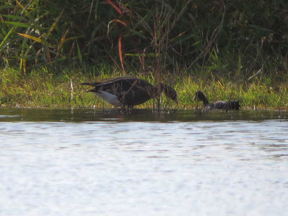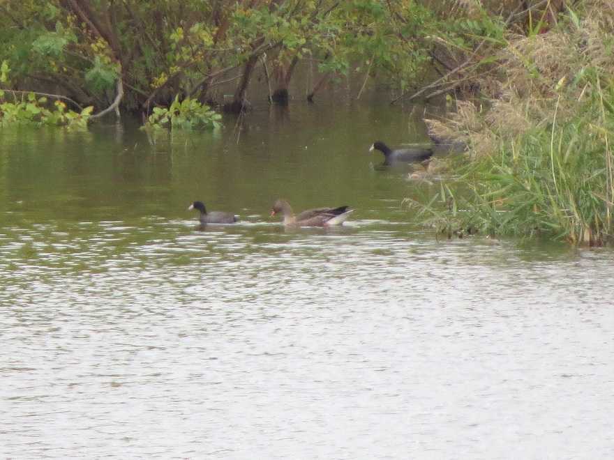 10月終盤にさいたま市にカリガネ1羽が飛来し滞在していると聞き、現地を訪ねました。その姿は広大な調整池にありました。到着時は、オオバン3羽と行動をともにし水面を移動したり休憩をとったりを繰り返していました。その後、草地で草の先端部を歩きながらむしり採食していました。立ち止まる時間のあるマガンとは行動に違いがありました。(観察した個体の特徴)・顔の白色部が小さく、嘴はピンク色で短めでした。・足はオレンジ色でした。・目の周りには黄色のアイリングがありました。(アイリングは成鳥より不明瞭と記述している図鑑もありますが、はっきりと黄色でした)・上嘴と額には角度があり、マガンの上嘴と額の角度が小さいのとは違いました。・写真ではわかりにくさがありますが、胸から腹の羽の先端が青海波(せいがいは)と呼ばれる波のような模様が見えました。・腹に黒色味や黒斑はありませんでした。・大きさはマガモ、カルガモに近い印象でした。上記のことから観察した個体は、カリガネ幼鳥と思われました。(カリガネ以外に観察した鳥たち)カイツブリ、カンムリカイツブリ、カワウ、アオサギ、オオバン、トビ、モズ、ハシボソガラス、ハシブトガラス、ムクドリ、ツグミ、ジョウビタキ、ホオジロ
