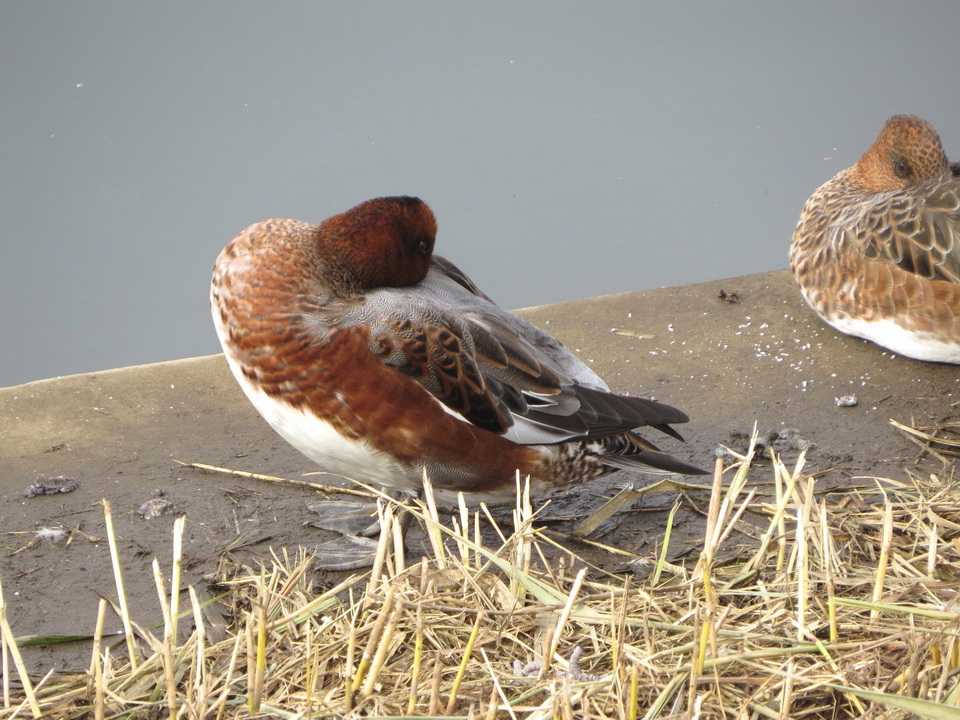 11月に入りはじめて柏の葉キャンパス駅東口、西口の調整池を探索しました。いずれの調整池は草刈りが終わっていてこれまでとは違って見通しが格段のアップし、羽をやすめている鳥たちの姿を観察しやすくなりました。カモ科ではヒドリガモ、マガモ、カルガモ、ハシビロガモ、オナガガモ、コガモ、チドリ科ではイカルチドリ、シギ科では複数のタシギの姿を見つけました。このほか、タヒバリが湿地の一角で水浴びをしている姿を観察しました。(カモは羽衣がいろいろ)・ヒドリガモは雄生殖羽、雄エクリプス、雄幼鳥、雌生殖羽、雌非生殖羽とじつにいろいろな羽衣を観察しました。一枚目の写真は頭、脇が赤みが強い雄エクリプス、二枚目は赤茶の頭にクリーム色の頭の雄生殖羽個体です。・オナガガモは三枚目の写真の個体で色味が生殖羽に比べてシックな色、胸から腹の斑が不均一でした。・四枚目の写真は虹彩が暗色で上面が黒っぽいハシビロガモ雌幼羽と五枚目の写真の虹彩が暗色で三列風切が黒褐色の雌幼羽と思われる個体を観察しました。・コガモは、五枚目の写真が雄幼羽が生殖羽に移行中の個体、六枚目の写真が雌非生殖羽と思われる個体で嘴基部側面に黄色味があり脇は丸みのある羽でした。七枚目は雄生殖羽と思われる個体を観察しました。(イカルチドリが今シーズンも飛来)目の周りに細く黄色のリングと翼を広げた際に細い白線があるイカルチドリを観察。頭のコントラストが不明瞭で額の黒色、羽色が淡いので雌個体と思われました。(写真)2025年11月2日撮影
