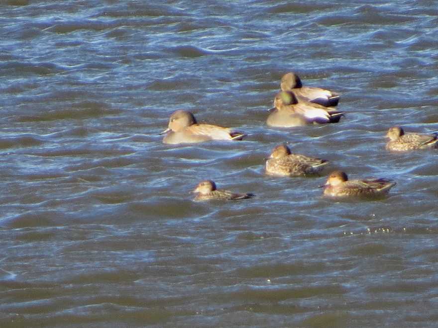 昼前から北よりの冷たい風が吹き抜けている中、ホームグランド手賀沼を探索しました。湖岸で鳥を探していると時折10メートル前後の風が吹き、体感は真冬並みの寒さでした。沼では、オカヨシガモ、ヒドリガモ、マガモ、カルガモ、コガモ、カイツブリ、カンムリカイツブリ、カワウ、アオサギ、ダイサギ、コサギ、オオバン、ユリカモメの姿を見つけました。また、昨日まで行事が行われていた水の館前には魚を捕食していたミサゴの姿がありました。鳥友からツグミ、クロハラアジサシを目撃したと聞いており、次回が楽しみです。(オカヨシガモの頭部の模様のいろいろ)オカヨシガモの姿は、柏市寄りの大津川河口近くにありました。雄に注目してみると、顔から頭頂、後頭が暗色の個体、頭部が灰色味のある個体と実にいろいろでした。(最も個体数の多かったのはマガモ)最も多くの個体が休んでいたのは、マガモでした。嘴が黄色で幅広い肩羽、赤味のある胸の雄エクリプスと嘴が橙色で暗色斑のある雌個体を見つけたり、観察する醍醐味を実感しました。(冷たい風が抜きぬけてもへいちゃらな顔のカンムリカイツブリ)波立つ沼の中央にカンムリカイツブリの群れが移動する姿を見つけました。ひたすら寝込んでいる個体、足をあげて伸びをしている個体がいたりじつにいろいろ。また、繁殖羽で見られる襟飾りが生えていた痕跡が残っているもの、冬羽で首が白く変化している個体を見つけました。(写真)2025年11月3日撮影