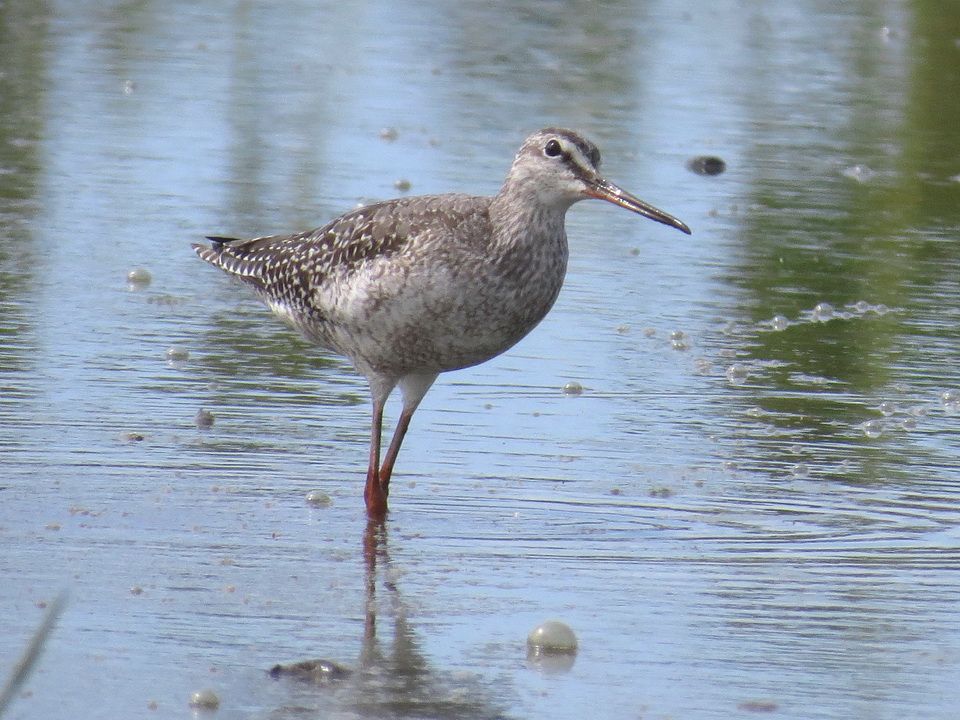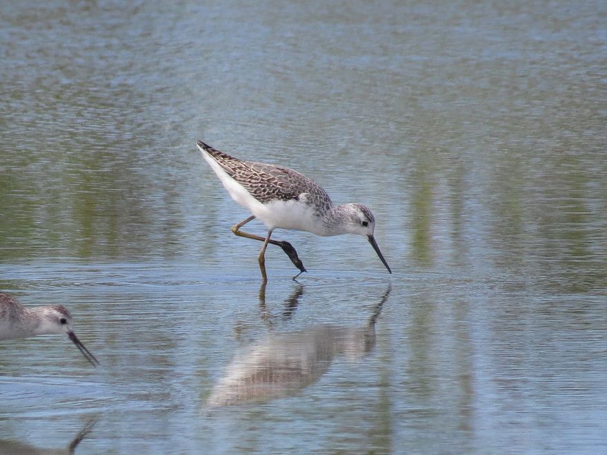 下嘴基部が赤くて喉から下面に斑があるツルシギの第一回冬羽個体など
