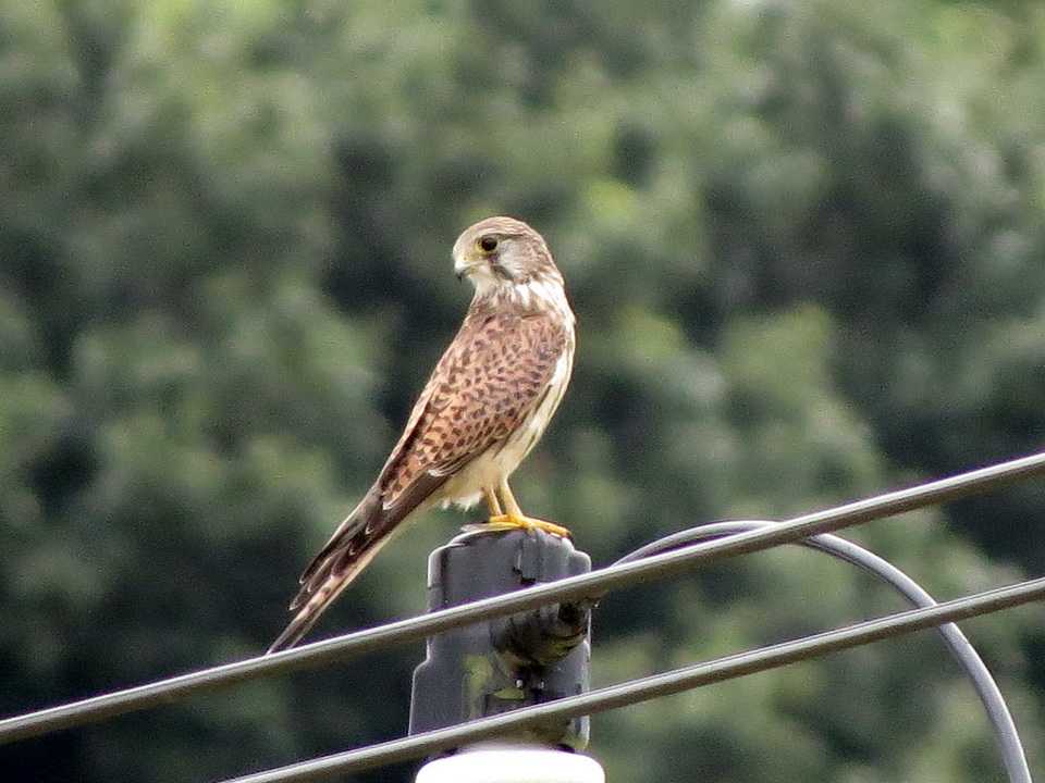 電線に翼帯1本の小鳥の姿と電柱にはチョウゲンボウの姿がありました。