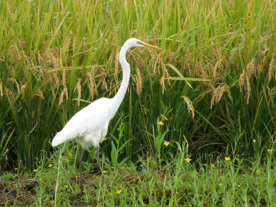 さらに水田との縁を探索すると、バッタやイナゴなどの餌を探すダイサギ、コサギ、