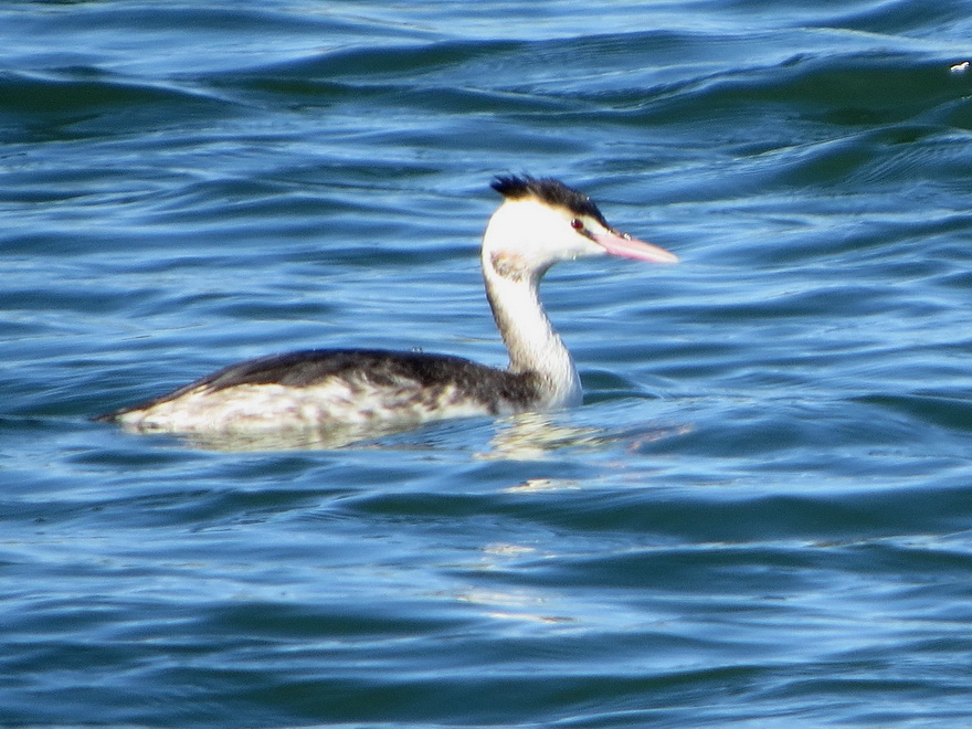堤防を降りて川沿いの道を進み、江戸川の水面に目をやるとカンムリカイツブリ成鳥と若鳥(顔から頸に縞模様)の姿を見つけました。