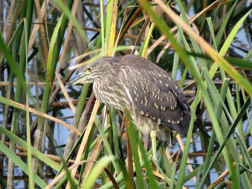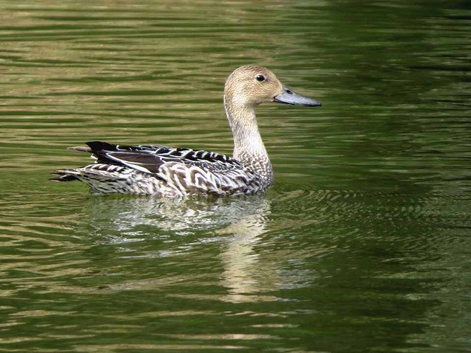 このほか、坂田ヶ池では、上面や脇の羽に丸みのある軸斑が見られ、羽縁が白色のオナガガモ若鳥が水面を移動する姿を見つけました。