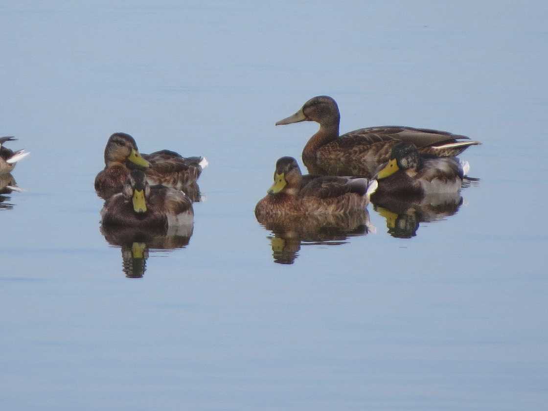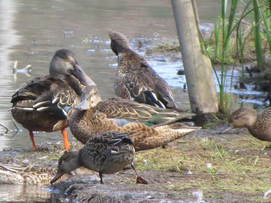 ヨシガモが水面を移動する姿を目で追っていると、上空からヒドリガモ、マガモ、上面が全体的に明るい色調のハシビロガモ生殖羽が降り立ちました。