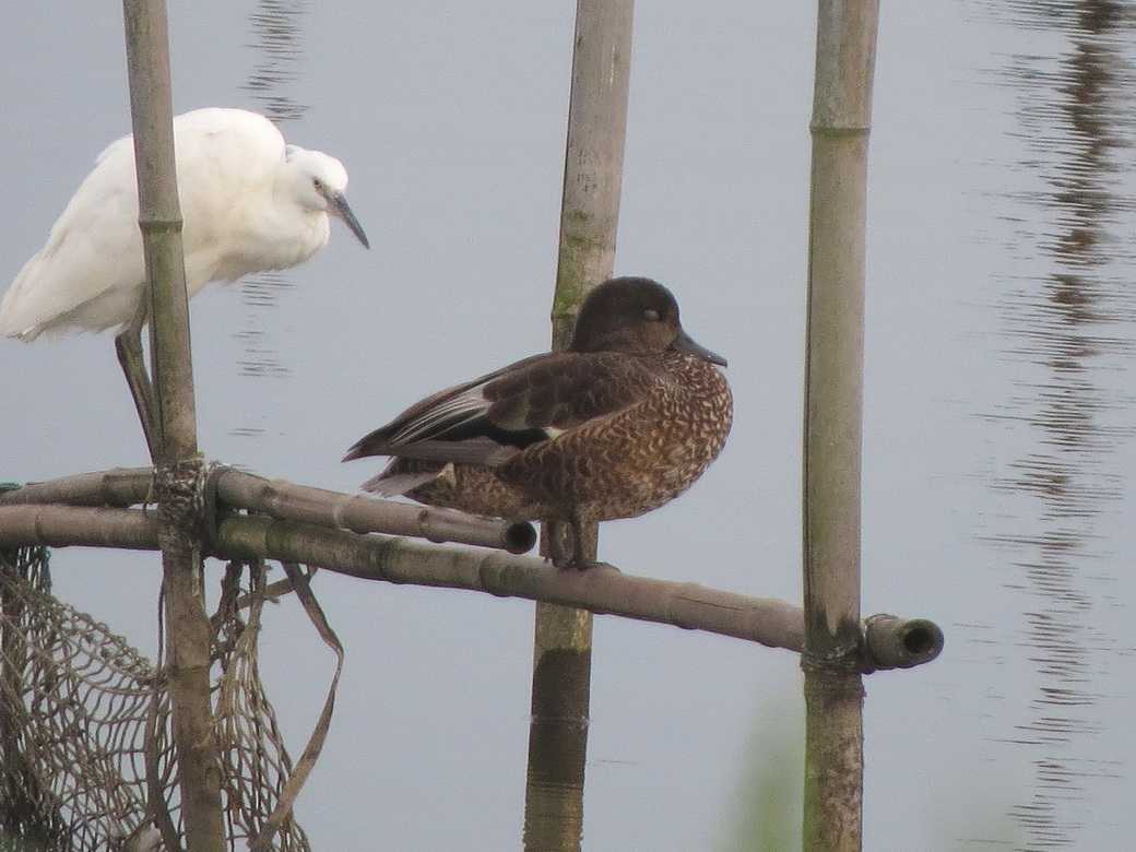 ヨシガモ雄エクリプスは頭部と上面が暗色で、一見しただけでは種類が識別しにくさがあります。しかし、頭部が一様に暗色で、肩羽に横斑があること、飾り羽が灰色で雌と異なる点を観察できれば雄個体とわかりました。
