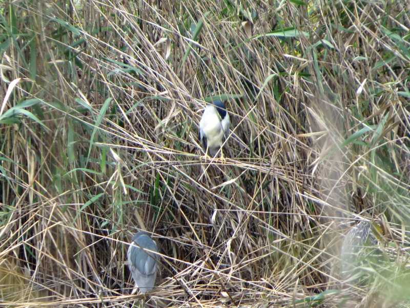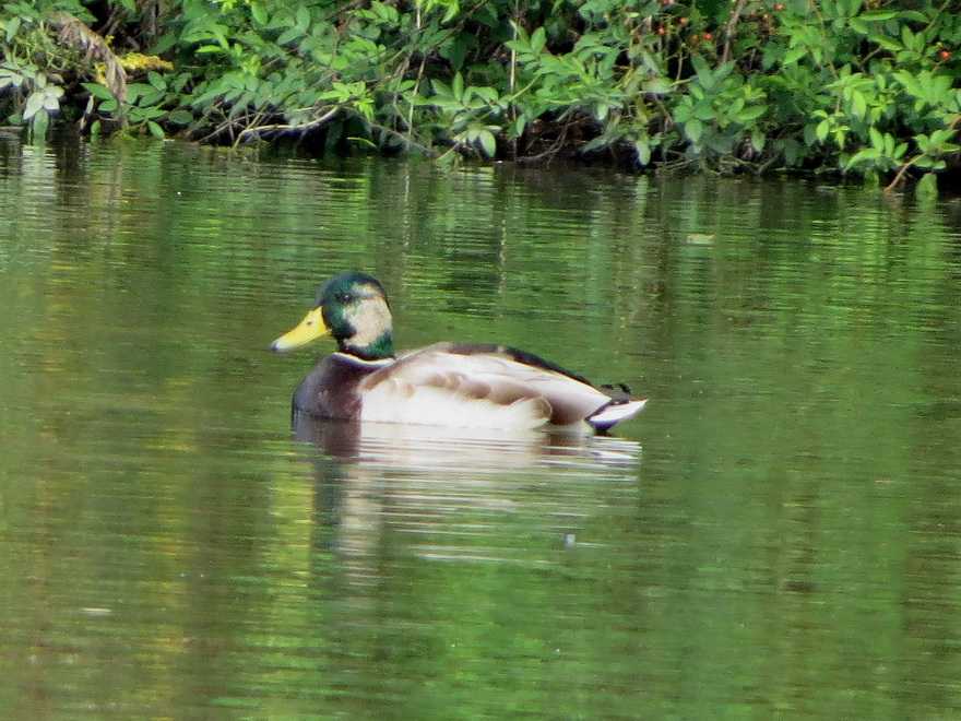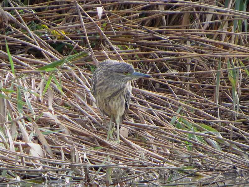 松伏町では、マガモ雄エクリプスが生殖羽に換羽中の個体、マガモ生殖羽、コガモ、葦原で休むゴイサギの姿、池の縁に登場したジョウビタキ、10羽前後のシジュウカラが小島にある木の葉についている虫を採餌している姿を観察しました。