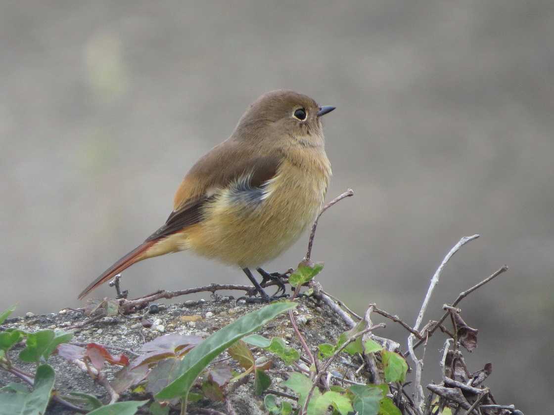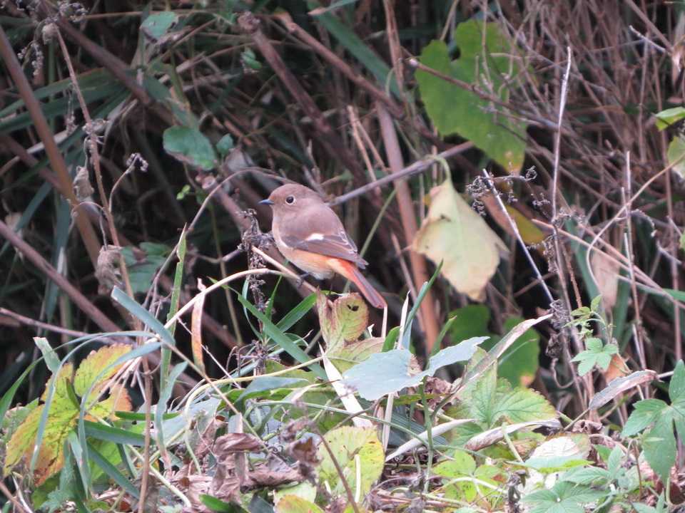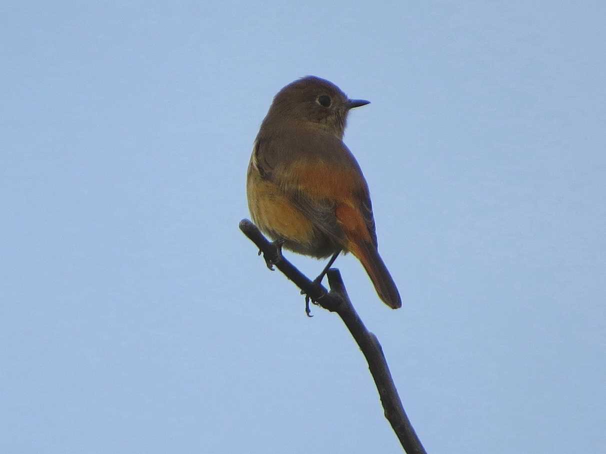 ところが、帰り間際に登場したジョウビタキ雌を見ると、脇のあたりがルリビタキのような青色。しかし、尾を見るとオレンジ色でジョウビタキとわかりました。