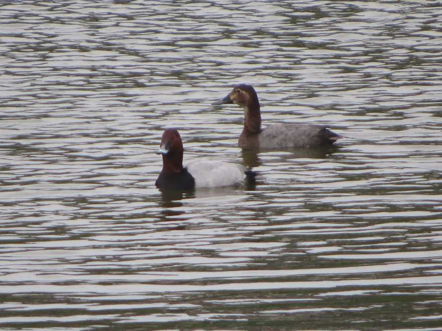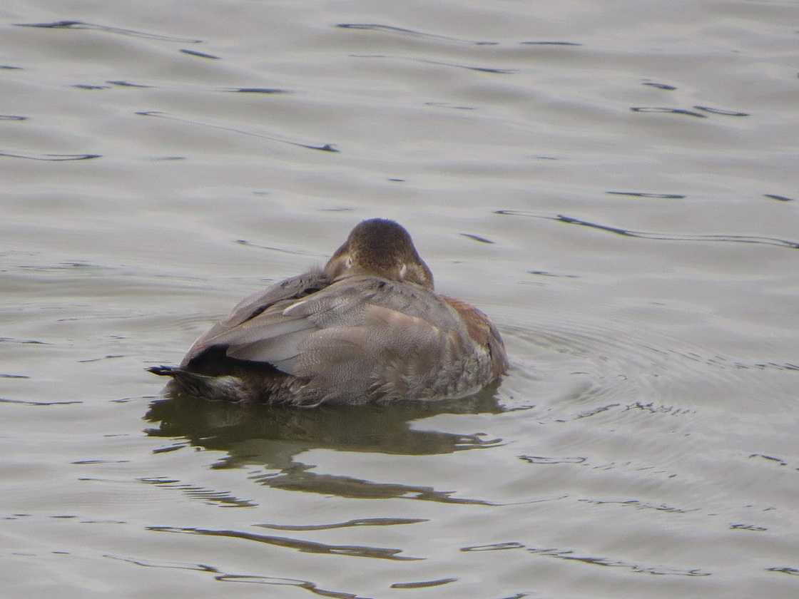 ホシハジロ雌は、目の周りのアイリングが白線が後方に伸びています。くわえて、口角あたりから眼の下にむかって頬線が伸びている模様が目立っていました。