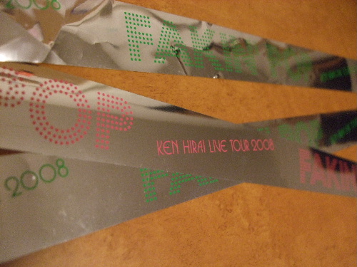 のこのこと初めての平井堅さんのLIVEに行ってまいりました3年ぶりに平井堅さんが沖縄でLiveを行なうという。しかも、野外!しかも、同じ敷地のコンベンションでは同じ日程でジュ○ーこと沢○研○さんのLIVEまで(^^;しかも、その同じ敷地内で別のお祭りしてるし(^^;;;; (LIVE中演奏が終わるとエイサーとか三線が聴こえてくるし・・・)しかも、今日は、沖縄一大きな花火大会がある日でもあるのに。。。おかげで、道はどこも大混雑さぁ~なんと、お席はど真ん中の7列目・・・びっくりするほどいい席だぁ~~堅さんも「(ステージと客席が)近い!」といってびっくりするくらいでしたし。。。(日没前のスタートなので、客席が見えるので、MCでお客さんと掛け合う姿もあった。)これがねぇ~、野外だから、いい雰囲気を出してましたよ日没直前からのスタートで、最後は満月が顔を出しているという、ステキなシチュエーションでした写真に収められないのが本当に残念実はあまり聴いたことないけれど、さびまでくればほとんどの曲を知ってました♪さすが、売れてるだけあります(笑)ステージも「お金かかってるなぁ~」って感じでした(笑)キラキラとか風船とか色々飛んできました(笑)野外ならではの解放感もあり、とっても楽しいLIVEでした☆堅さん自身も、野外って言うことで楽しんでいる様子も伺えました(^^)高音がとっても綺麗な歌声でしたベーシストが異常に熱くノリノリだったのが気になりました(笑)個人的には、『瞳を閉じて』が好きだったので、生で聴けてうれしかった♪あと、最後に独唱で唄った、天国のお父さんに捧げる曲?(だと思うのですが。)が、すっごく心に響きました。いい曲でした~。全体的にとっても楽しい、いいLIVEでした!明日が千秋楽らしいですが、また行きたいなぁ~って思えるLIVEでした(^-^)また近いうちに来てくれないかなぁ~ちなみに、昨夜、首里城からホテルまで1時間歩いて帰ったらしいのですが、誰にも気付かれなかったらしい・・・沖縄ではありがちな顔なので、逆に目立たなかったようだ・・・と本人も分析(笑)そして、「夕食のときに教えてもらった沖縄語」を披露されてました。しかし・・・沖縄語・・・なぜか最後の挨拶だけは宮古島の言葉になってましたよ(笑)これには一緒に行った友だちと笑ってしまいましたが(^^;;;(いわゆる沖縄語は沖縄本島で使われている言葉。島々によって言葉が全く違います。)記念にこんなものが売っていたので、思わず購入してみました☆堅ちゃんティーバック開けるのがもったいない(笑)