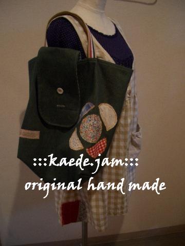いつも*kaede.jam*の掲示板にご参加ありがとうございます^^お時間を割いて書き込みして頂いている皆さまに少しでも感謝の気持ちを!ということで思い付いた書き込みランキング。先月2月に企画したわけですが・・・プレゼントに用意したのはエコバックwたっくさん入れても大丈夫なようにデニムで作り、いろんな生地でお花をパッチしました。色は私の大好きなグリーンwぜひ、ご活用くださいね。=後側==中側=結果報告で~すw一番書き込み頂いたのは りくたいさんいつも温かいコメントありがとうm(_ _ )m中身が飛び出ないように蓋も付けました。気に入ってもらえるといいナ~wりくたいさんにはほんと仲良くしてもらっていて先日はニット帽をプレゼントしてもらったの^^見て見てーーーヽ(〃≧∀≦)ノこのピンクッションも待針も頂きました。縫製をする私にはほんと~に嬉しいプレゼントでした^^ニット帽はサイズもぴったり(* ̄ー ̄)b色合いもナチュラルで私の作る洋服と合います。りくたいさん、ありがと実はトレードプレゼントなんだけど、ちゃっかり先に頂いちゃって私はスケジュールのこともありまだ発送できてません(汗)お待たせしちゃってかたじけない( ̄▽ ̄;)ゞ私からのエプロンワンピはリクエスト頂いたこちらw今日発送なのでもうしばらくお待ちくださ~い。いっぱい着てやってくださいなm(_ _ )mブログランキング参加中 いつもクリックありがとうございます^^ ←今日もポチっとお願いね ←クリックすると私のホームページに飛べま~す☆*kaede.jam* BBS掲示板☆*ヤフオク出品中です*覗いてみてね☆