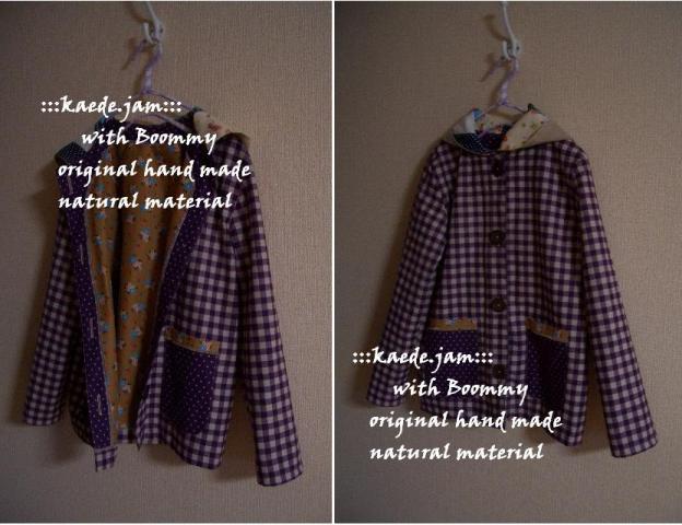 少し前のblogに書いた私のパーカージャケットを見たいとメールを頂き、UPするのをすっかり忘れていたことに気付きました^^;いつものことながら忘れっぽいです。自分のblogをたまには読み返した方がいいですね( ̄▽ ̄;)ゞハハハ...ボタンホールもきちんと開けて今一番出番が多いジャケットです。大きめウッドボタンとフードのバッドマンがポイントです。相変わらずアメコミ好きでスミマセン(笑)厚手の綿麻ギンガムチェックぶどう色×ナチュラルを使い、裏地はレトロな花柄でガーリーテイストに仕上げました。これ着てる人を見かけたら『楓さ~ん』と声かけてください(笑)ブログランキング参加中 いつもクリックありがとうございます^^ ←今日もポチっとお願いね ←クリックすると私のホームページに飛べま~す☆*kaede.jam* BBS掲示板☆*ヤフオク出品中です*覗いてみてね☆