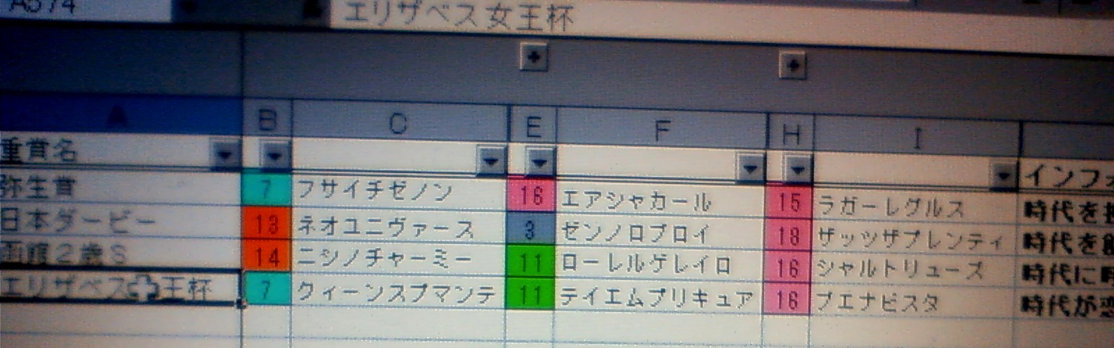 忘れな草賞はサクラローズマリーと決めていて、パドック観ていたら、「う~~ん。やっぱりどの馬もいいなぁ~♪」グリーンチャンネルのゲストの津田照さんが、「デリキットピースがいい。前走中山で急坂で~~。」この一言で、買っちゃいました。↓ ↓ ↓ ↓ ↓ ↓『残念桜花賞』に完全に気を取られてしまい。。。本番では、予想が追いつかない~~。(信じられない~~)馬券がとっても残念でした。>同枠に一番人気馬と最低人気馬の同居。↑は「一番人気がくる」と確信しました。去年の有馬では、1人気と最低人気の同居が8枠。どちらも馬券に。01年の有馬では、1,2番人気馬の同居枠が8枠。人気がぶっ飛ぶ。ということは、「有馬記念」限定の8枠。注意