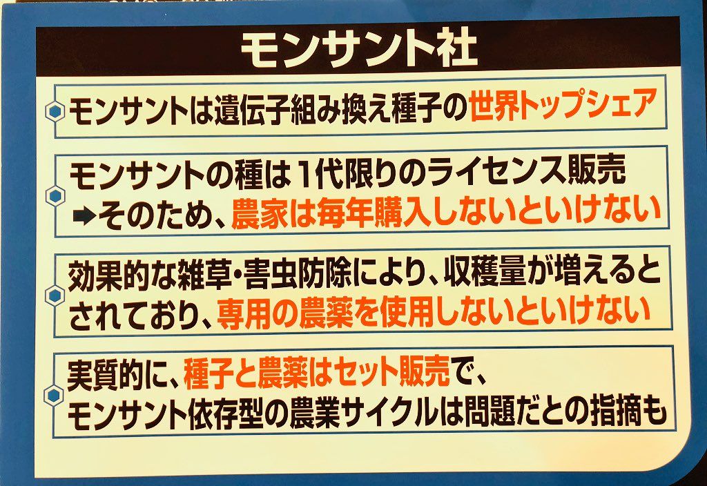 、これから 国民に周知徹底させると、しかも モンサントと組んで、イベントを始めました。しかも年内に NonGMOの表示基準を0%にすると発表、日本では 事実上NonGMOの表示ができないように使用と話しています。