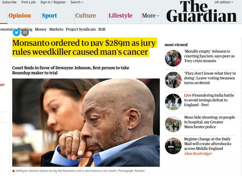 日本の日本経済新聞でも、モンサントは1兆円の賠償金の支払いは免れないのではとして、同社を買収したバイエルは株価が20%下がったと報道しています。