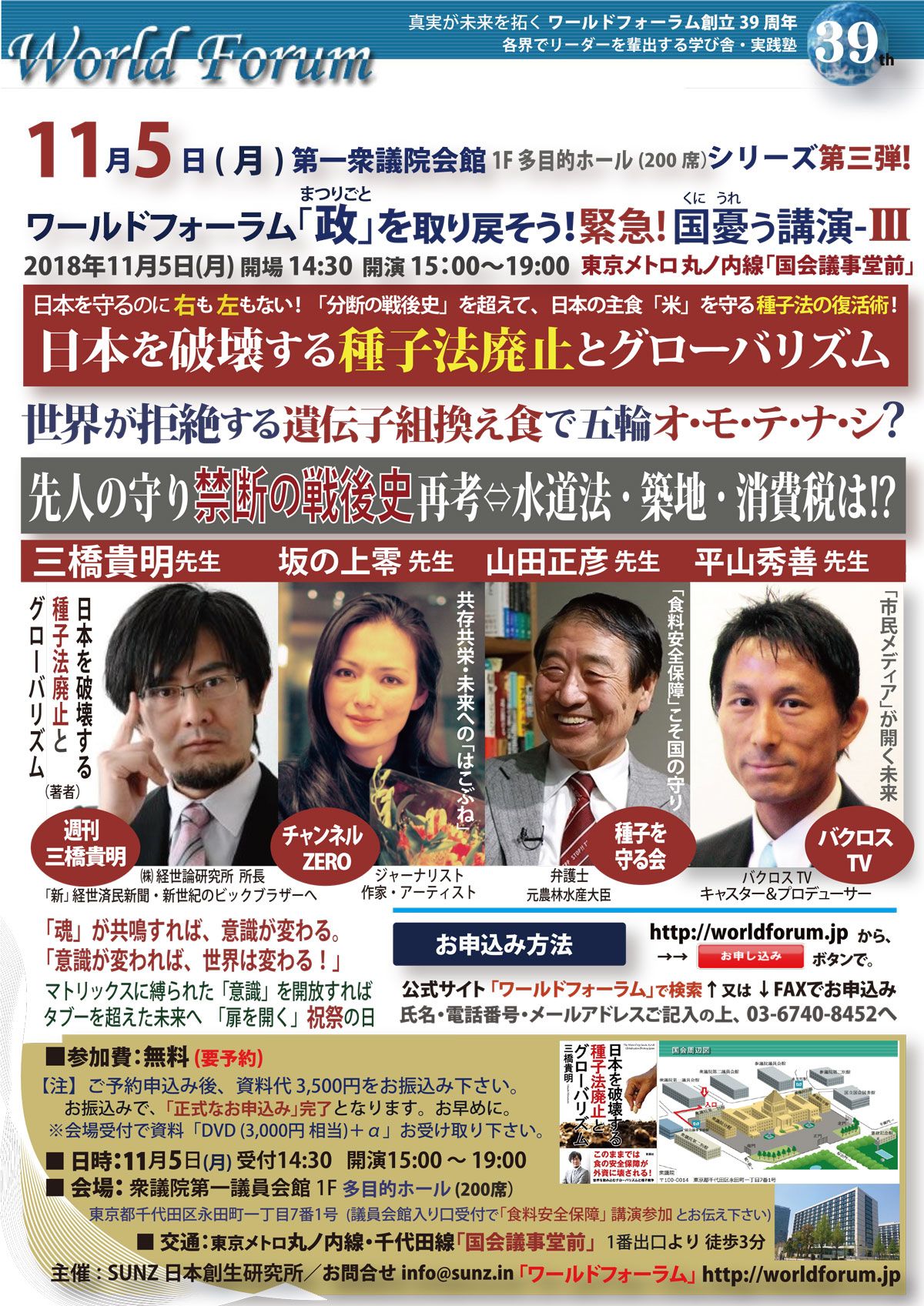 【ご案内】11月5日(月) 緊急! 国憂う講演会 第3弾! 三橋貴明先生 x 山田正彦先生 x 坂の上零先生 x 平山秀善先生 「禁断の戦後史をバクロス!」 東京 第一衆議員会館