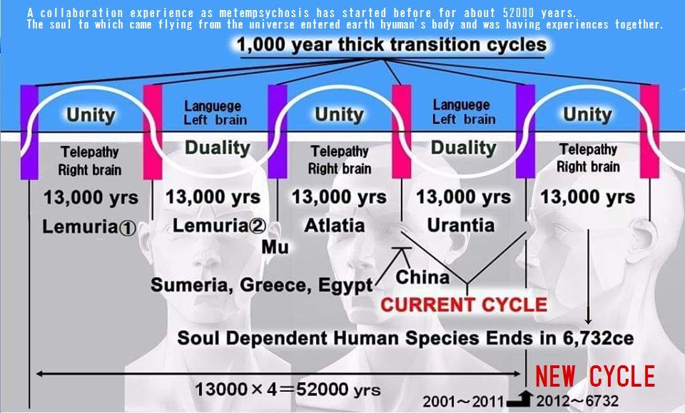 実は 約52000年前に 宇宙飛来の魂たちが 地球人の身体に 入り込んで 宇宙人魂と 地球人魂の 合体コラボの輪廻転生が 始まりました!! 実に、これで さらに 完璧な図表になりますね(^_-)