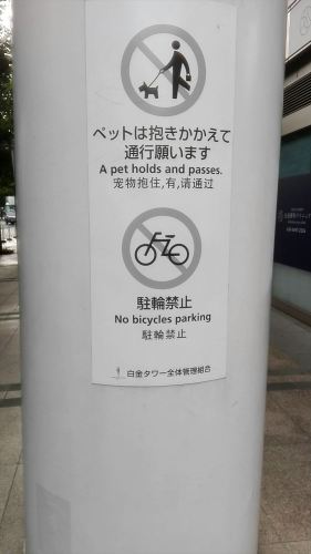 先日、街中を歩いていたら、ビジネスビルの敷地にこんな看板が。ここではペットは抱きかかえて歩かないといけないみたいです。抱きかかえられないような大型犬は連れてこられないですね。