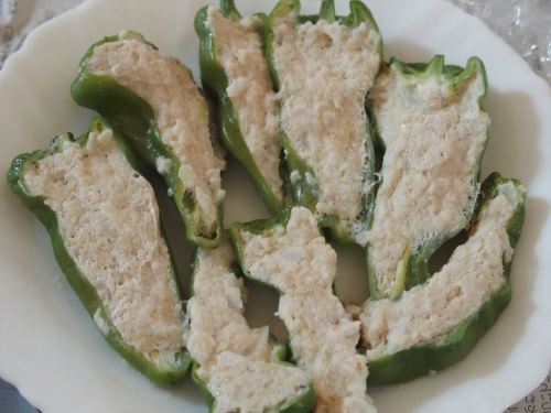 豚肉と鶏肉が余っていたのでピーマンの肉詰めを作りました。^^ピーマンが無農薬のせいか、少し小さくて形も良くなかったですが、とても美味しかったですよ。^^作り方は豚肉、鶏肉、タマネギのみじん切りにコショウと洋風だしを加え、半分に切ったピーマンに詰めてレンジでチンするだけ。油も使わずに出来てヘルシーでした。^^
