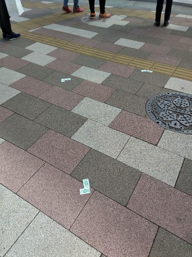 歩道に何やらシールがたくさん貼ってありました。近付いて見ると。。。ガス管が、 ┏\ ┛こんな感じで埋まってますよってことなんですかね。