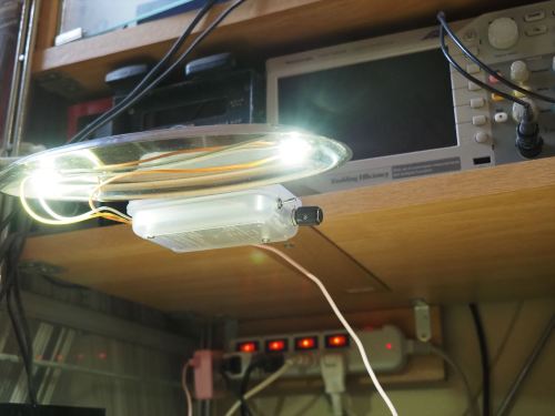 先日、久々に電子工作をしました。作業机に手元灯が欲しかったので調光ライトを作りました。こんなやつです。百均で買ってきた楕円形の金属皿に白色LEDを2個取り付けました。その向こうにはスイッチ付きの調光回路を50円のタッパに入れて付けてあります。木製のアームの途中はネジ止めしてあって、回転して格納できるようにしてあります。上から見るとこんな感じ。机の上を明るく照らしてくれます。^^これはアームを回転させて格納させたところ。こんな感じで使わないときはジャマになりません。