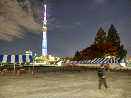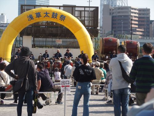 山谷堀広場になにやら会場の準備が出来ていました。ポスターも看板も何にもないですが、高さのないステージと来賓席(?)があるところを見ると、いつもの太鼓のイベントと思われます。^^;家に帰って調べたらやっぱり太鼓のイベントです。「第6回浅草太鼓祭」だそうです。いっぱい人が集まりそうです。^^