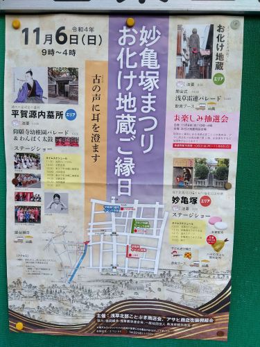 明日は、妙亀塚まつりとお化け地蔵ご縁日ですね。幟の写真しか載せてなかったので、ポスターも載せておきますね。やってる時間にぶらぶらと行ってみたいと思います。^^